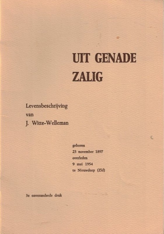 Uit genade zalig, levensbeschrijving van J. Witte-Welleman, geboren 23 november 1897, overleden 9 mei 1954 te Nieuwdorp (Zld). Derde ongewijzigde druk. |