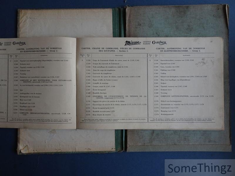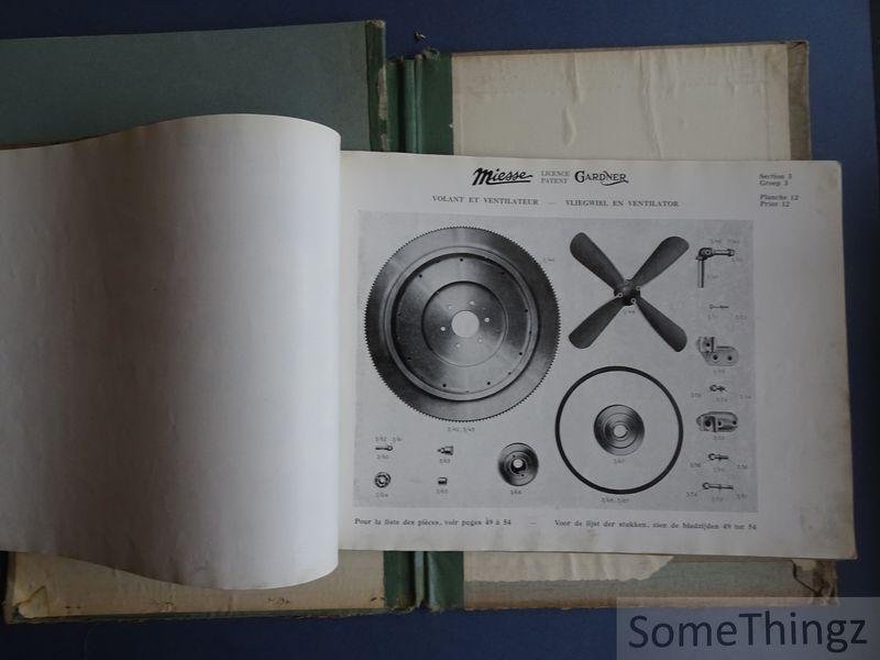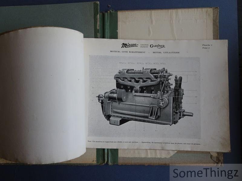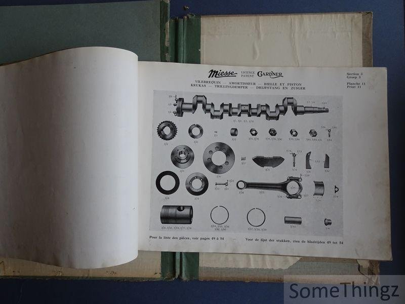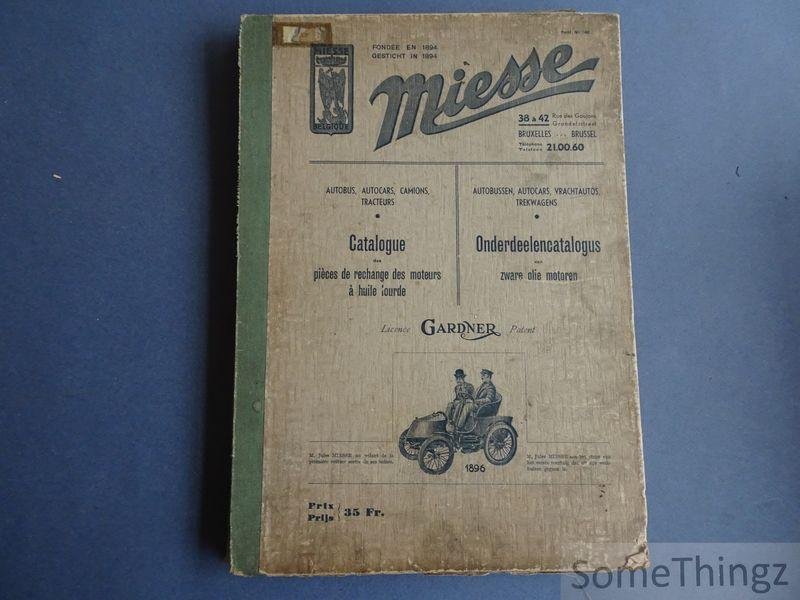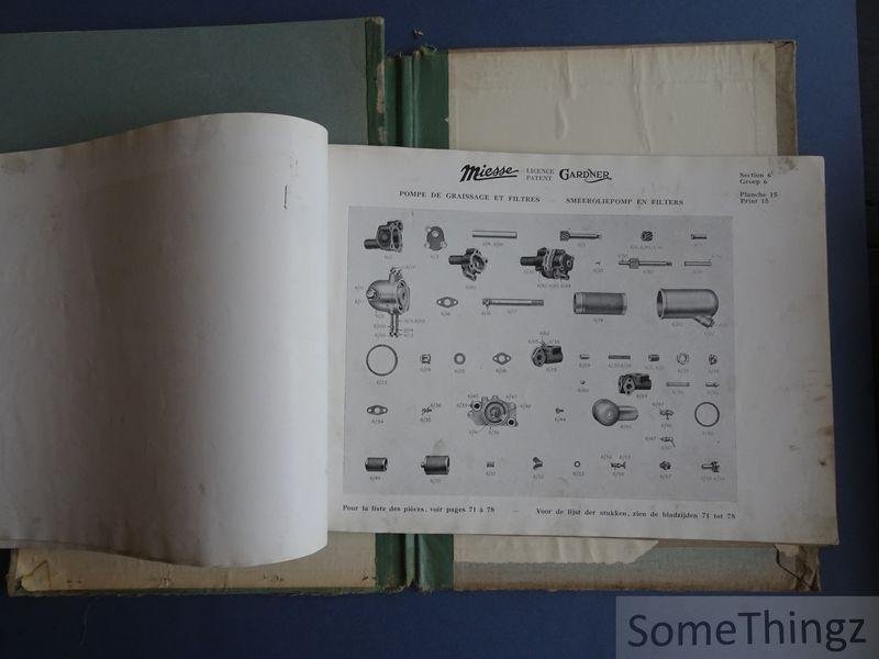 | Titel: | Automobiles Miesse. Autobus, autocars, camions, tracteurs. Catalogue des pièces de rechange des moteurs à huile lourde. / Autobussen, autocars, vrachtauto's, trekwagens. Onderdeelencatalogus van zware olie motoren. Licence Gardner Patent. |