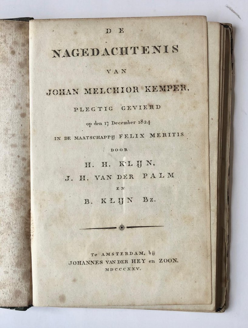 ![- [Book with manuscripts J.M. Kemper, 1824] Exemplaar van het gedrukte boek 'De nagedachtenis van Johan Melchior Kemper plegtig gevierd op 17-12-1824 in Felix Meritis, door H.H. Klijn, J.H. v.d. Palm en B. Klijn Bz', Amsterdam 1825. Gebonden, me...](https://images.boekwinkeltjes.nl/medium/2lQy1O2WbB5kkboKIvjK.jpeg)