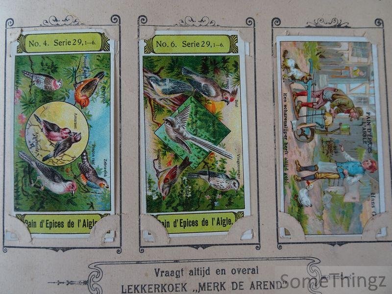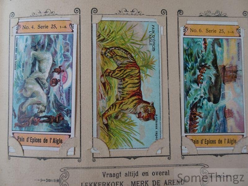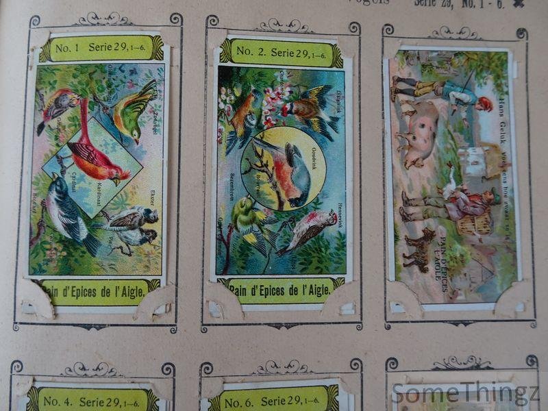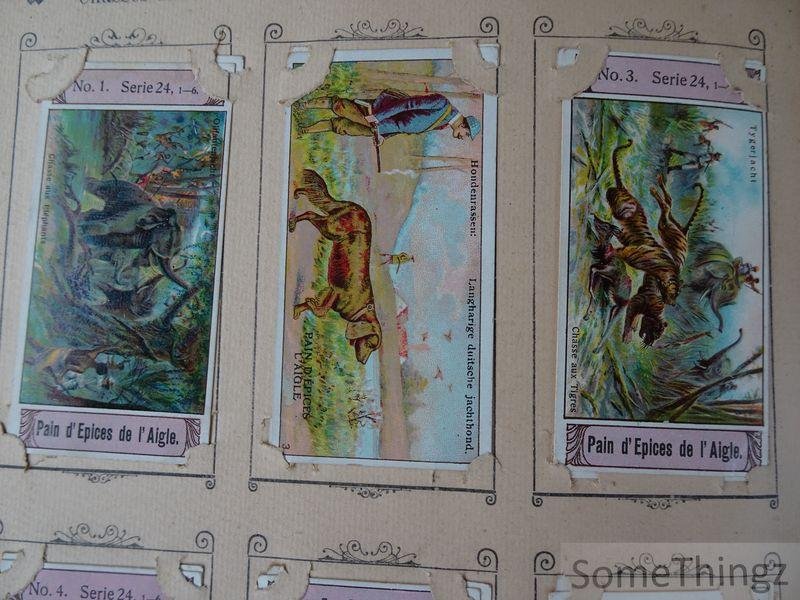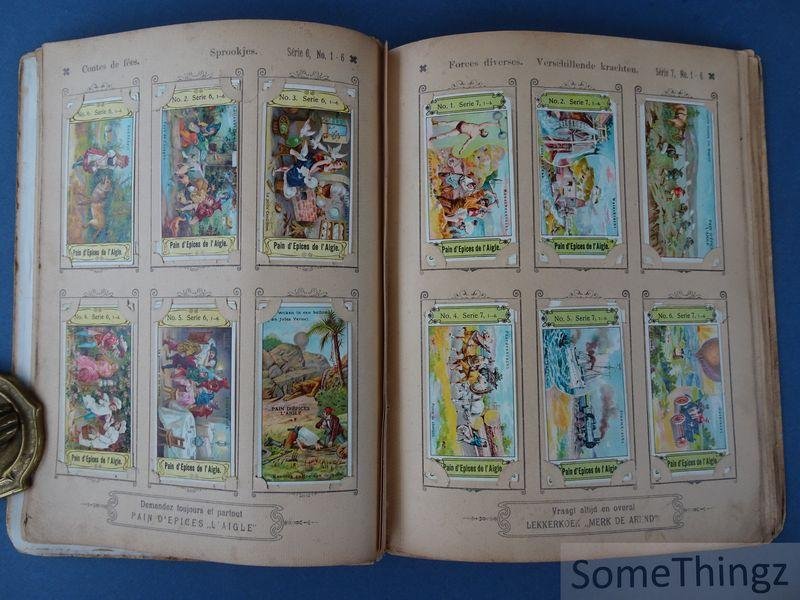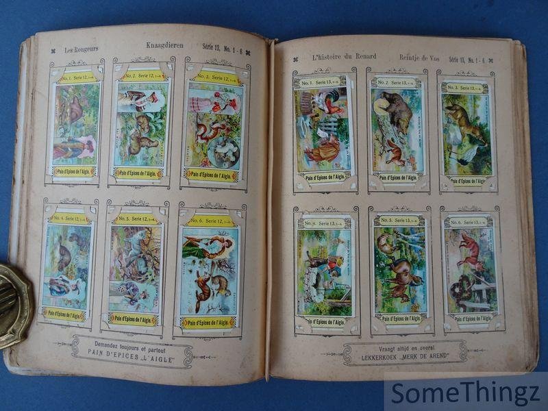 Manque les 14 chromo's suivantes (ils ont été remplacés par d'autres chromo's de séries moins anciennes par Van Reusel et Thienpont): série 3, n°3 / série 6, n°6 / série 7, n°3 / série 10, n°3 / série 15, n°2, 4 et 5 / série 17, n°3 / série 19, n°2 / série 21, n°6 / série 24, n°2 / série 25, n°5 / série 29, n°3 et 5. Cet album publicitaire ancien et rare était destiné à la collection et à la présentation de cartes réclames éditées par les fabricants de pain d'épices E. Van Reusel et F. Thienpont à St. Nicolaes-Waes, en Belgique. Il illustre une pratique commerciale courante à la fin du XIXe siècle et au début du XXe siècle, visant à fidéliser la clientèle par la diffusion d'images attrayantes et éducatives. L'album se distingue par la qualité de son impression et par son lien direct avec l'histoire de la publicité et de l'industrie alimentaire belge. L'album est conçu pour accueillir une série de cartes réclames illustrées, imprimées en couleur, représentant des scènes enfantines, des thèmes moraux, historiques ou folkloriques, ainsi que des images liées à l'imaginaire populaire. L'ensemble constitue un témoignage précieux de la culture visuelle, des techniques publicitaires et des habitudes de consommation en Belgique autour de 1900. E. Van Reusel et F. Thienpont étaient des fabricants belges de pain d'épices établis à St. Nicolaes-Waes (Sint- Niklaas). Leur entreprise s'inscrivait dans la tradition artisanale et industrielle de la confiserie régionale. À travers leurs cartes réclames et albums promotionnels, ils ont contribué à la diffusion d'une iconographie publicitaire aujourd'hui recherchée par les collectionneurs.
