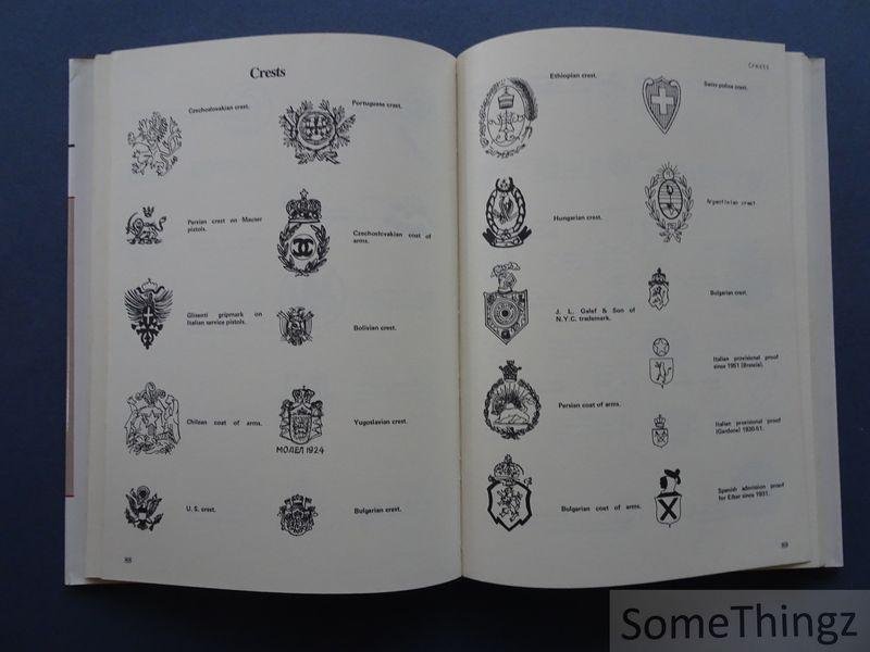 Gunmarks contains an extensive collection of trade marks, proof marks, and inspection symbols used by firearm manufacturers worldwide from approximately 1870 to the present. The marks are systematically organized by type and structure, including letter marks, monograms, figurative symbols, and geometric designs. Each mark is accompanied by contextual information about the corresponding manufacturer, often including model and caliber details. The second section of the book provides an alphabetical index of firearm manufacturers linked to their respective marks, making it a practical identification guide for collectors, historians, and dealers.
