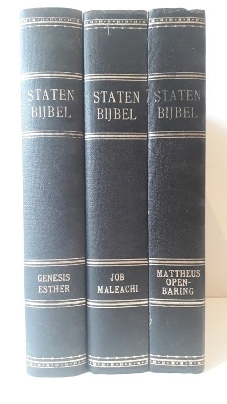 Driedelige Statenbijbel met kanttekeningen naar de uitgave van Jacob en Pieter Keur. - Genesis-Esther - Job-Maleachi - Mattheüs-Openbaring Formaat 28 x 20 x 14 cm. |
