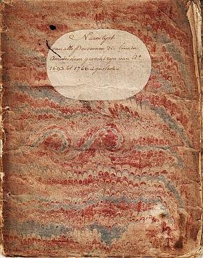 Amersfoort, M. Langenwagen, 1748. Amersfoort, M. Langenwagen, 1748. 18e-eeuws gemarmerd omslag met ovaal handgeschreven titelkaartje. 44 p. Omslag verkleurd en aan de zijkanten versleten. Oude eigenaarsnaam "Isaac Barre" (tweemaal) en andere inscripties op de binnenkant van de omslag. Veel aandacht voor ‘sodomieten’ (p. 33-36 en 42). Een 'chirurgyn' werd onthoofd vanwege een vergiftigingsmoord (p. 9). Emotionele brieven aan zijn kinderen worden aangehaald. Veel van de daders van de verschillende misdaden waren slechts 17 of 18 jaar oud. In 1767-1778 verschenen meer edities. Isaac Barre (overleden 1774) was een verzamelaar van boeken en prenten. 4 in STCN, 1 in Worldcat (Staatsbibliothek Berlin).