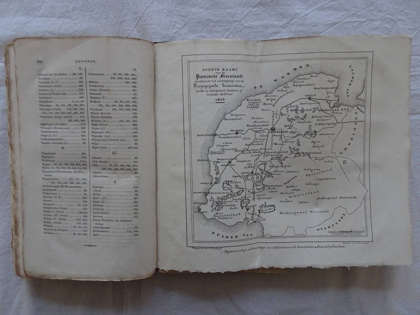 | Bijzonderheden: | 1839; Leeuwarden; cardboard (new binding); 8vo; with a folding map of the province of Friesland with marks of the Mennonite community; XII, 394 pp. |