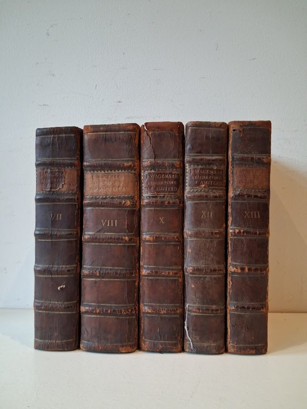 Amsterdam, in zyne Opkomst, Aanwas, Geschiedenissen, Voorregten, Koophandel, Gebouwen,Kerkenstaat, Schoolen, Schutterye, Gilden en Regeeringe, beschreeven door Jan Wagenaar, Historieschrijver der Stad. Vijf stukken: VII, VIII, X, XII en XIII. Platen en titelprenten ontbreken. |
