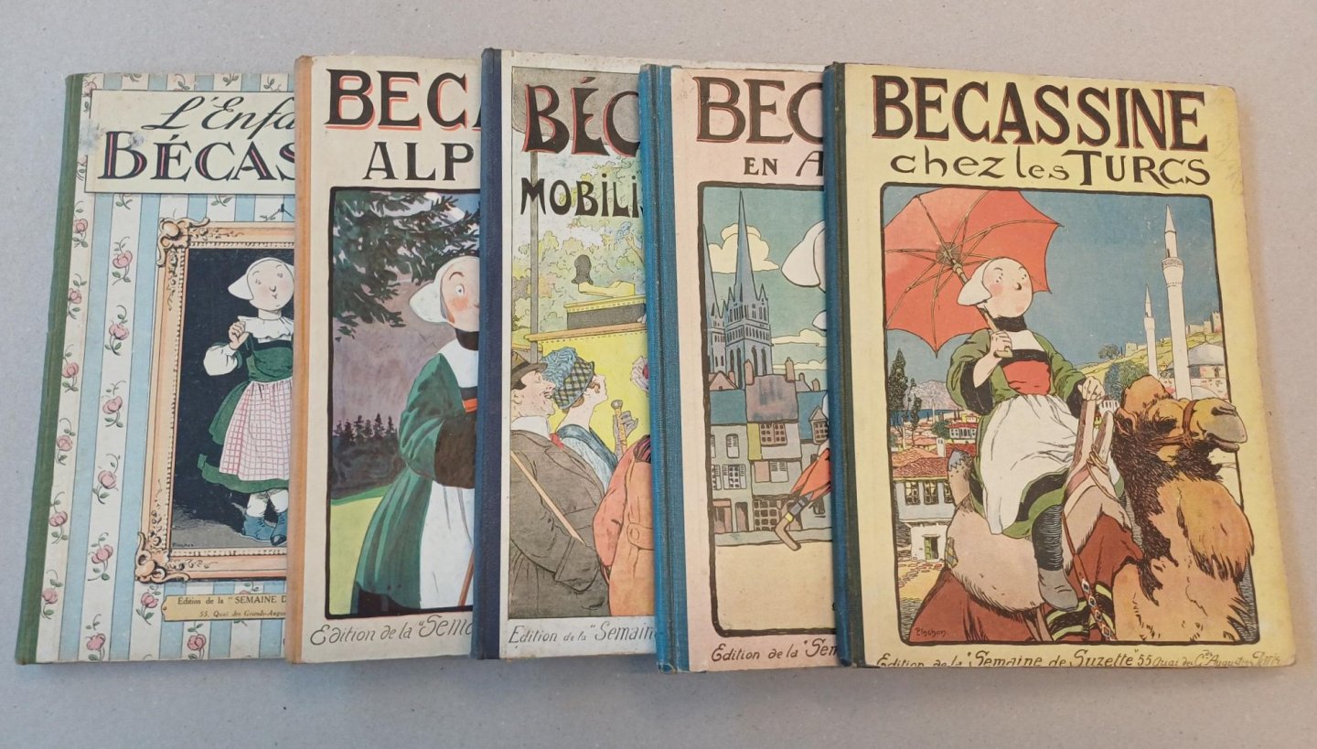 Contains: Becassine chez les Turcs, Becassine Mobilisee, Becassine Alpiniste, Becassine en Apprentissage, Becassine Pendant la guerre, Becassine Voyage, Becassine Chez les Allies, Becassine Les Cents Metiers, l'Enfance de Becassine and lastly La Semaine de Suzette dix-neuvieme annee premier semestre.