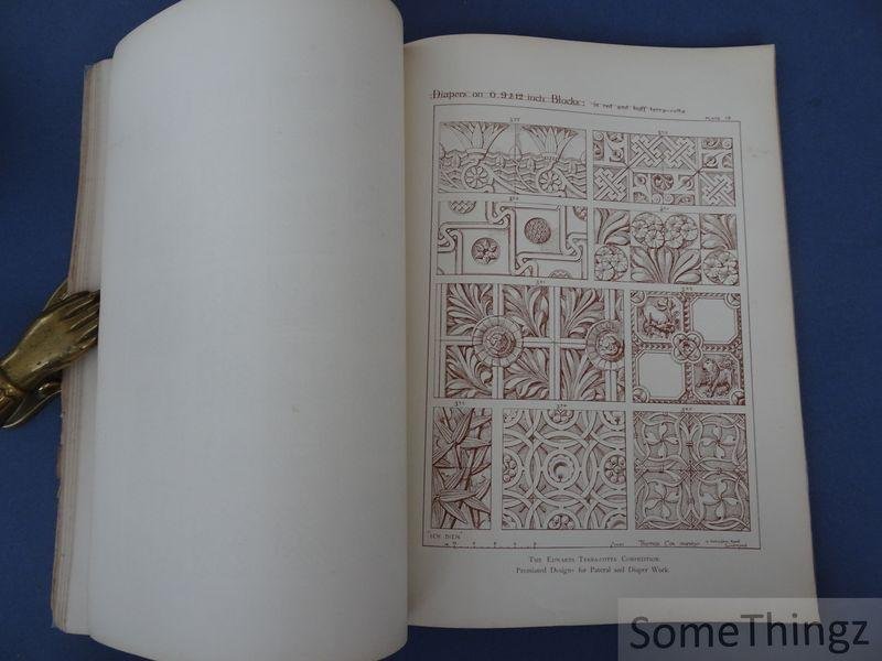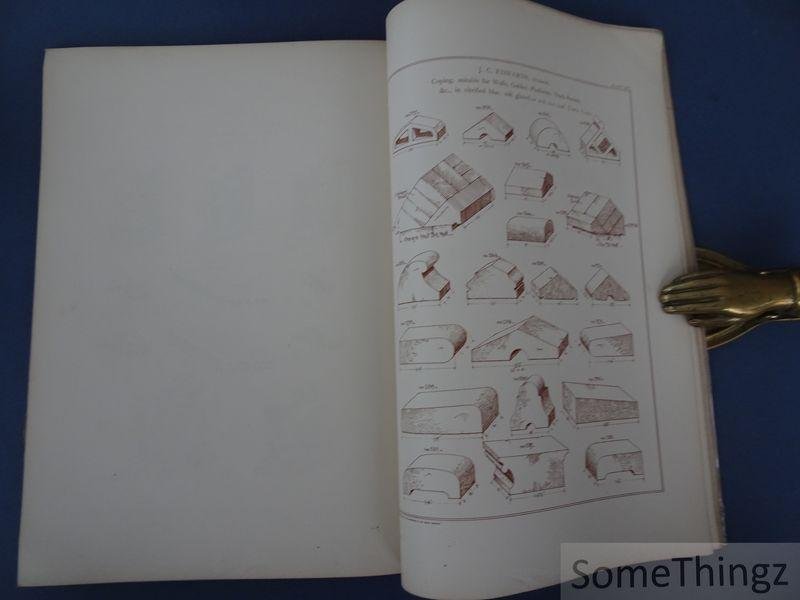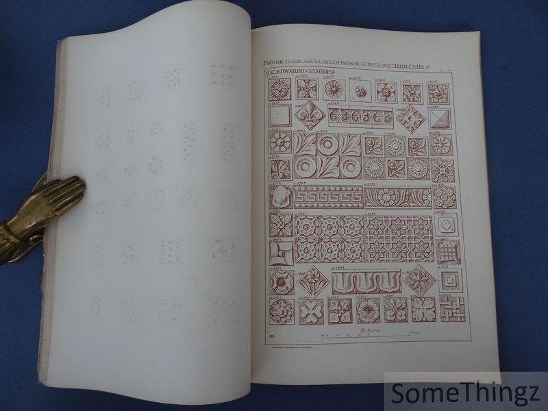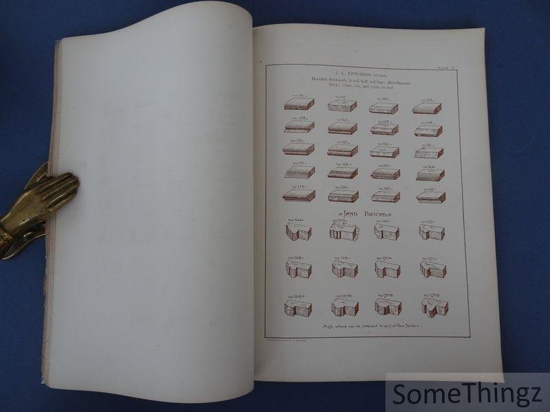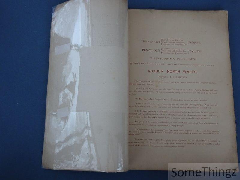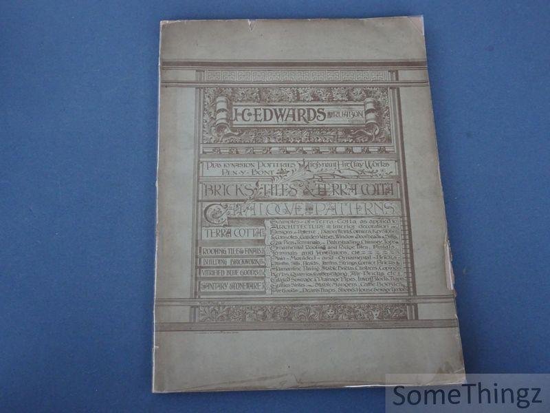 Very rare and decorative product catalogue by J.C. Edwards, Ruabon. The products and objects of this famous manufacturer are still very much appreciated, collected and highly sought after by lovers of the Arts-and-Crafts-mouvement. This rare catalogue contains examples of Terre Cotta (terra-cotta as applied to architecture, interior decoration, designs for paterce, diaper-works, cornices, keystones & consoles, garden vases, window and door heads, sills, gate piers and terminals, balustrading, chimney-tops), Roofing Tiles and Finials (ornamental roofing and dige tiles, finials, terminals and vanetilators), Building Brickwork (plain moulded and ornamental bricks, plinths, sills, heads, jambs, strings, cornice bricks), Vitrified Blue Goods (Adamantine paving, stable bricks, clinckers, copings, kerbs, quarries, garden edging, air-bricks, elc), Sanitary Stoneware (glazed sewage and draining pipes, invert blocks, traps, gullies sinks, stable mangers, cattle boozies, fire goods, dean's traps, shone's housee sewage ejectors).