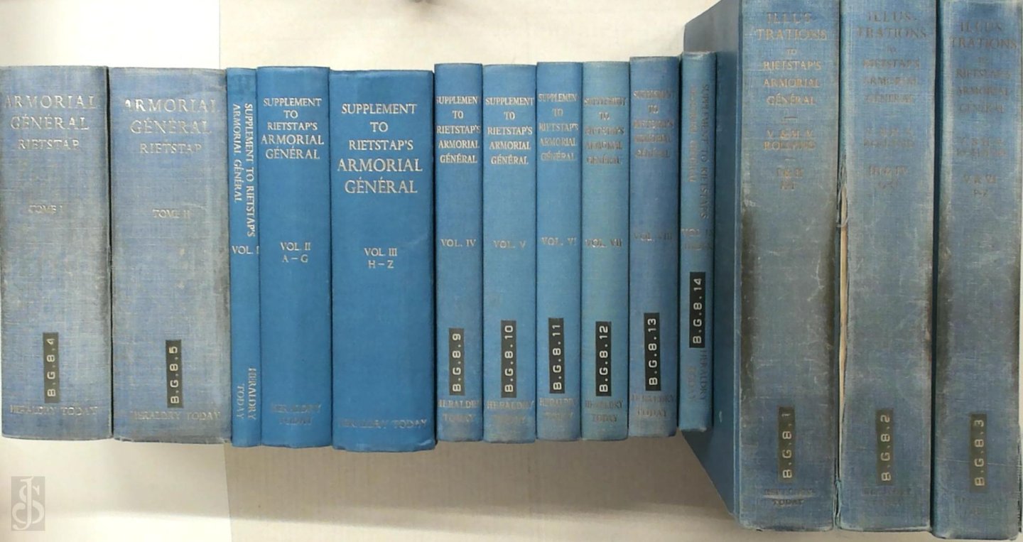 | Meer info: | Armorial Général Rietstap Tome I + Tome II/ Illustrations to the Armorial Général (6 volumes bound as 3)/ Supplement the Armorial Général (8 volumes) + Index to the Supplement (1 volume) |