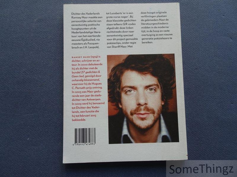 Dichter des Vaderlands Ramsey Nasr maakte een persoonlijke selectie van eenentwintig poëtische hoogtepunten uit de Nederlandstalige literatuur: van het veertiendeeeuwse Egidiuslied, via meesters als Focquenbroch en J.H. Leopold, tot Luceberts er is een grote norse neger . Bij deze klassieke gedichten staan telkens QR-codes afgedrukt: deze linken rechtstreeks door naar eenentwintig speciaal voor dit project gemaakte poëzieclips, onder regie van Shariff Nasr. Met deze hoogst originele verfilmingen plaatsen de gebroeders Nasr de literatuurgeschiedenis midden in de moderne tijd, in de hoop en vaste overtuiging zo een nieuwe generatie poëzielezers te bereiken. Ramsey Nasr (1974) is een Nederlandse dichter, schrijver, essayist, acteur, regisseur, librettist en vertaler van deels Palestijnse komaf. Hij was de tweede stadsdichter van Antwerpen en was van januari 2009 tot januari 2013 Dichter des Vaderlands van Nederland; in deze functie vervulde Nasr ook het ambassadeurschap van de Turing Nationale Gedichtenwedstrijd. Nasr snijdt in zijn werk vaak maatschappelijke onderwerpen aan.