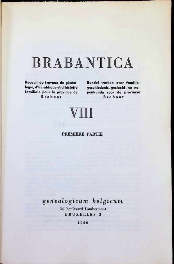 Brabantica Verzameling van genealogische, heraldieke en familiegeschiedeniswerken voor de provincie Brabant, bundel werken over familiegeschiedenis, geslacht- en wapenkunde voor de provincie Brabant, Deel VIII, eerste deel Paperback, 245 x 160 mm, Deel VIII / 1: 221 pp ex; nr: 166/500 lichte gebruikssporen op de omslagen binnenin in goede staat