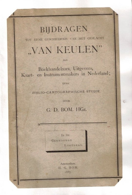 Bijdragen tot eene Geschiedenis van het Geslacht "Van Keulen" als Boekhandelaars, Uitgevers, Kaart- en Instrumentmakers in Nederland door G.D. Bom. HGz. Eene Biblio-Cartographische studie. - Geslachtswapen - Voorwoord - Geslachtboom en gevoerde Firma's - Inleiding - Levensschetsen - Bijlagen |