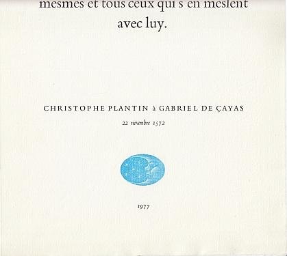 | Meer info: | (Amsterdam, Blauwe Maandag Pers [= Huib van Krimpen]), 1977. Plano. 35,5 x 22,5 cm. Aan de randen wat verkleurd. Excerpt in renaissancefrans uit een brief d.d. 22 november 1572 van Christoffel Plantijn aan Gabriel de Çayas. Met de hand gezet en gedrukt in blauw en zwart. |