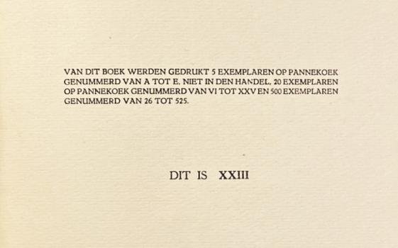 Antwerpen, De Sikkel (deel I) en Antwerpen/ Utrecht, De Sikkel/ De Gemeenschap (deel II), [1929]. Twee delen. Ingenaaid. 160; 164 p. Gedrukt in een oplage van 525 genummerde exemplaren. 1e druk. Ruggen licht verbruind, paar roestvlekjes onderaan omslag deel I. Mooie set. Eén van de slechts 25 Romeins genummerde luxe-exemplaren op Pannekoek.