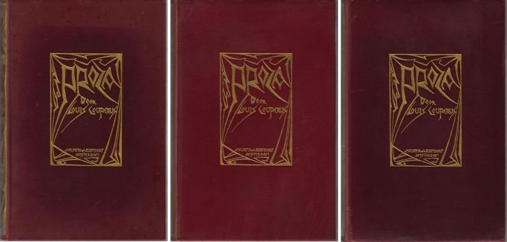 Amsterdam, Van Holkema & Warendorf, [1923-1925]. Drie delen. Oorspronkelijk verguld roodbruin heelleder, deel 1 en 2 met leeslinten; deel 3 werd daarvan niet voorzien. Koppen verguld en ook de inslagen zijn mooi verguld. 324; 304; 320 p. Uniform blauwgroen gemarmerde schutbladen. 1e druk. Ruggen wat verschoten (deel 3 meer dan de andere twee), leer heeft enkele kleine krasjes, beetje roest in het binnenwerk. Helaas werd voor deze luxe-editie een zeer kwetsbare ledersoort gebruikt, waardoor perfecte sets eigenlijk niet bestaan. Luxe-editie ('Weelde-uitgave') in heelleder met fraaie art-decobandstempeling. VV 320,4: 'Het aantal luxe-exemplaren staat niet vast, maar zal niet veel meer dan enkele tientallen zijn geweest'. Het eerste deel van deze verzameling feuilletons werd samengesteld door Couperus zelf, die op 16 juli 1923 zou overlijden, de twee andere door zijn weduwe. Collectie Veen 1.2.