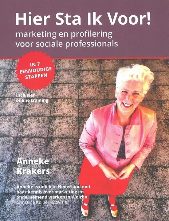 'Hier Sta Ik Voor!' is speciaal voor sociale professionals die beter zichtbaar willen zijn en hun werk beter op de kaart willen zetten. Het is een liefdevol boek bomvol kennis, inspiratie en actie over marketing en profilering waar veel sociale professionals op dit moment zo’n behoefte aan hebben. De schrijver, Anneke Krakers, is zelf maatschappelijk werker en elf jaar directeur geweest van een welzijnsorganisatie. Ze heeft aan den lijve ervaren hoe het is om niet gezien te worden, niet gewaardeerd te worden en steeds maar weer die vraag te krijgen "En wat doen jullie nu eigenlijk?". Anneke heeft na een jarenlange worsteling ontdekt dat er een manier van marketing en profilering bestaat die vriendelijk en zacht is. Waarmee je jezelf kunt verkopen zonder ‚verkoperig’ te doen. In dit boek legt ze uit hoe je in 7 eenvoudige stappen werk kunt maken van jouw marketing en profilering. Daarbij kunnen de lezers concreet aan de slag met de stappen met behulp van de aanvullende online training. Door zelf deze 7 stappen consequent toe te passen is Anneke inmiddels een succesvolle ondernemer die al vele duizenden sociale professionals heeft geholpen om het geld en de waardering te krijgen die ze verdienen. Naast de uitleg van de 7 stappen, delen in dit boek dertig sociale professionals hun ervaringen, inzichten en gedachten in korte quotes. Wat het boek afmaakt zijn de verhalen van Anneke over haar eigen twijfels en geluksmomenten in haar persoonlijke groei van maatschappelijk werker naar sociaal ondernemer. |