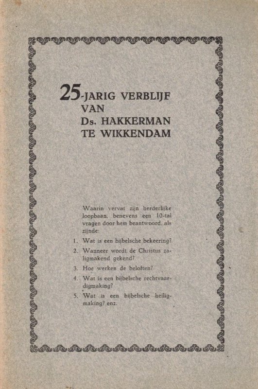 25-jarig verblijf van ds. Hakkerman te Wikkendam door H.J. Schoonderbeek te Ede (1951), zijn herderlijke loopbaan.