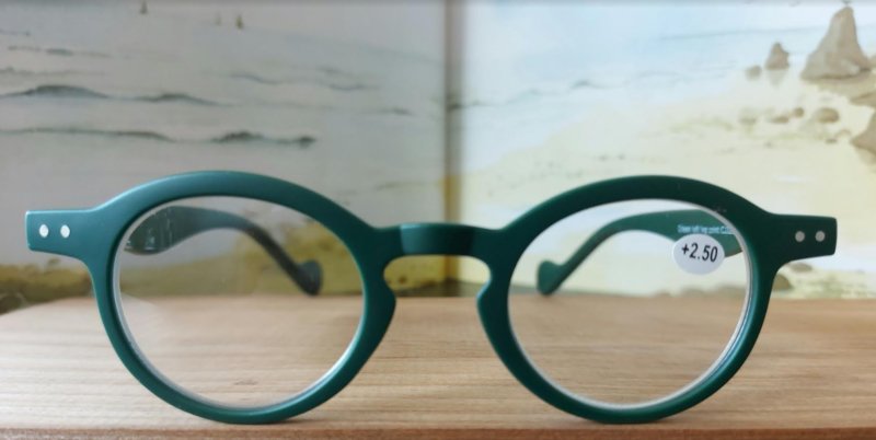 Groene leesbril, sterkte +1,50, onmisbaar voor iedereen die moeite heeft met het lezen van teksten.
