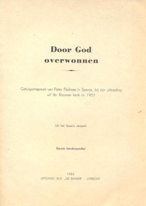 Getuigenispreek van Pater Padrosa in Spanje bij zijn uittreding uit de Roomse kerk in 1951 De Banier-Utrecht-1952 8 blz. |