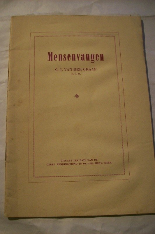 Een boekje over mensenvangen van de Nijkerkse predikant C.J. v.d. Graaf Uitgave ten bate van de Gereformeerde Zendingsbond in de Ned. Herv. Kerk 19 blz. Iets smoezelig, verder goed |