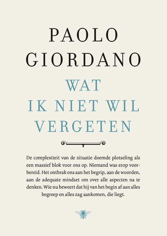 Giordano brengt niet alleen een verhelderende terugblik op deze ingrijpende tijd, maar in Wat ik niet wil vergeten gaat hij op zoek naar een nieuwe balans tussen rede, emotie en verwachtingen. Want we zullen, wanneer de storm eindelijk is gaan liggen, op zoek moeten naar een nieuwe, toekomstbestendige manier van leven. |