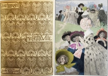 Paris, Société Française d'éditions d'art, L.-Henry May, éditeur, 1898. 25 x 18 cm. Halfmarokijn met brede hoeken (gesigneerd V. Champs). Rug rijk verguld. Originele, rijk vergulde omslag meegebonden in art nouveau-stijl (L. Rudnicki): voorkant, achterkant en rug. (4), 52 p. Kop verguld. Kopergravures door Frédéric Massé naar aquarellen van Manuel Orazi, met de hand gekleurd door M. Saudé. Gedrukt in 300 genummerde exemplaren. 1e druk. Band licht verkleurd. Dit is één van de 250 exemplaren op velin à la cuve de Rives. Prachtig luxe boek met een schitterende band. Fantastische, gedetailleerde illustraties, meesterlijk met de hand ingekleurd. Er ligt een grappige, handgeschreven brief van Lorrain in (alleen het laatste blad: 7 regels met ondertekening), gedateerd '23 Juillet, Fécamp', waarin de auteurs Georges Ohnet en Xavier de Montépin worden genoemd (de laatste met een leuke pun op zijn -pin...). Waarschijnlijk gericht aan een uitgever. Er ligt een knipsel in het boek uit een veilingcatalogus van Beijers te Utrecht uit 1980, waarin deze combinatie: luxe boek met handgeschreven brief, al vermeld wordt. Een fantastisch geheel!