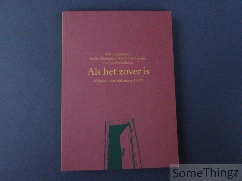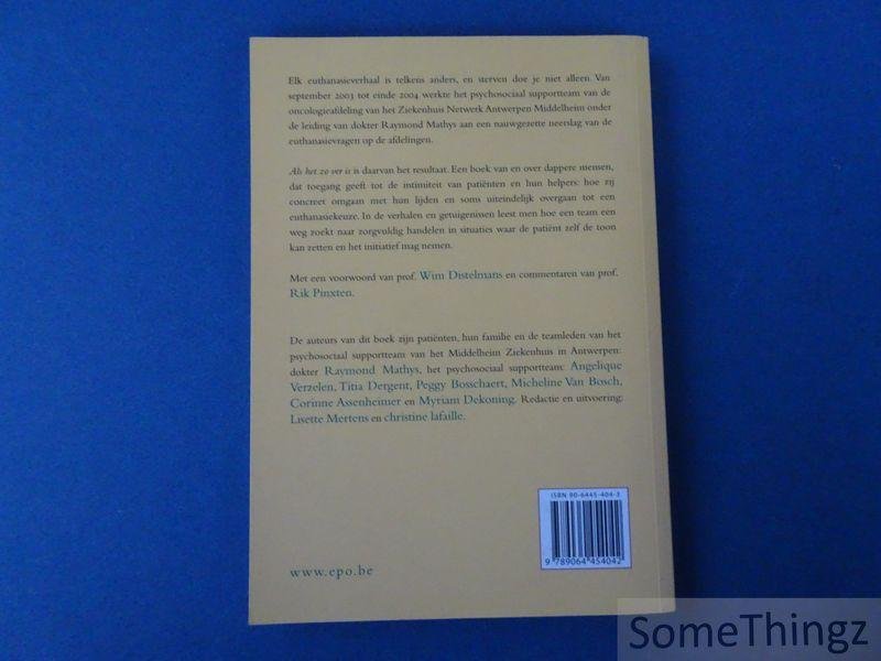 Elk euthanasieverhaal is telkens anders, en sterven doe je niet alleen. Van september 2003 tot einde 2004 werkte het psychosociaal supportteam van de oncologieafdeling van het Ziekenhuis Netwerk Antwerpen Middelheim onder de leiding van dokter Raymond Mathys aan een nauwgezette neerslag van de euthanasievragen op de afdelingen. 'Als het zo ver is' is daarvan het resultaat. Een boek van en over dappere mensen, dat toegang geeft tot de intimiteit van patiënten en hun helpers: hoe zij concreet omgaan met hun lijden en soms uiteindelijk overgaan tot een euthanasiekeuze. In de verhalen en getuigenissen leest men hoe een team een weg zoekt naar zorgvuldig handelen in situaties waar de patiënt zelf de toon kan zetten en het initiatief mag nemen. De auteurs van dit boek zijn patiënten, hun familie en de teamleden van het psychosociaal supportteam van het Middelheim Ziekenhuis in Antwerpen.