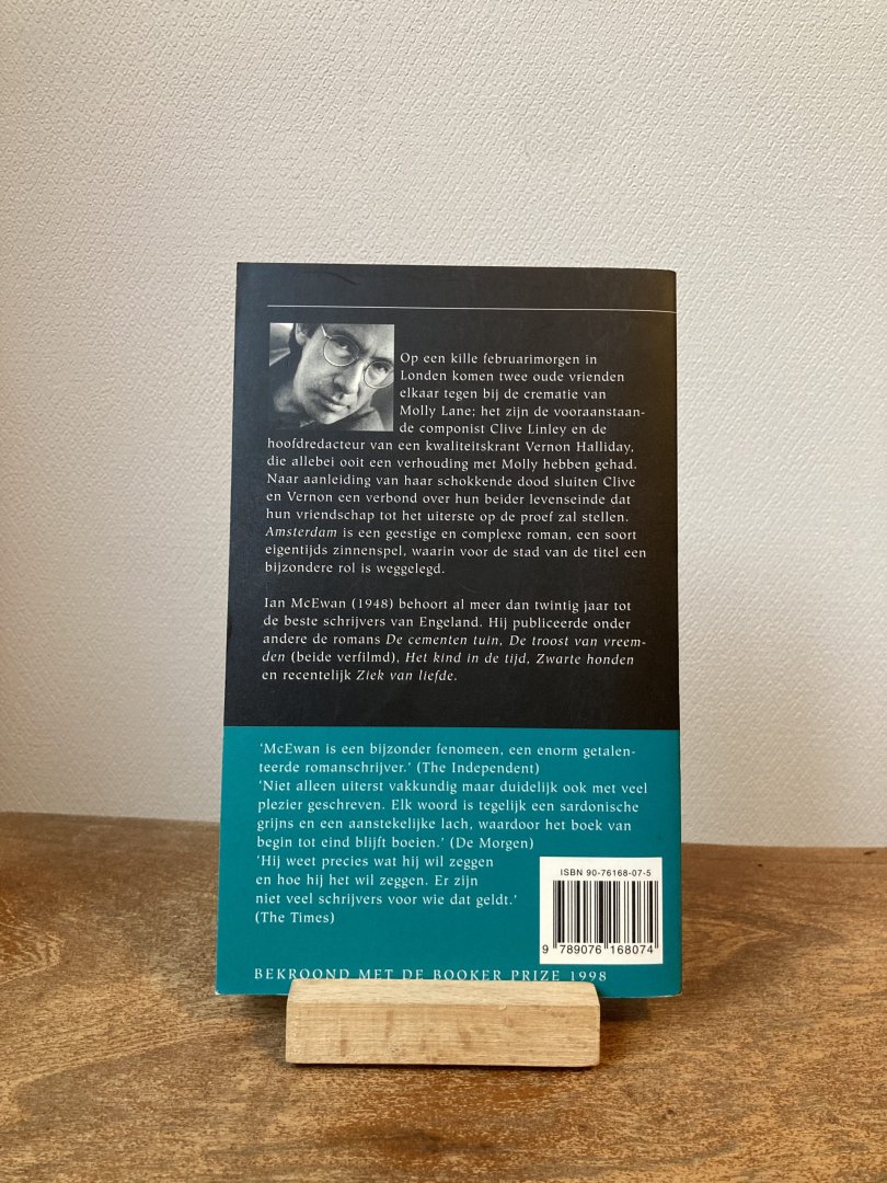 Amsterdam laat zien hoe morele keuzes ontsporen wanneer persoonlijke rancune en intellectuele zelfrechtvaardiging elkaar versterken. McEwan verbindt een scherp psychologisch portret aan een satire op culturele en politieke macht. De roman markeert een fase waarin zijn werk expliciet reflecteert op verantwoordelijkheid en schuld. Literaire status Bekroond met de Booker Prize (1998).Bekijk ook mijn andere boeken en bespaar op verzendkosten. Beschrijving Op een koude februariochtend in Londen ontmoeten twee oude vrienden elkaar bij de crematie van Molly Lane, een vrouw met wie zij beiden een verhouding hadden. Clive Linley is componist, Vernon Halliday hoofdredacteur van een kwaliteitskrant. Hun hernieuwde verbintenis, gevoed door herinnering en rivaliteit, mondt uit in een pact dat bedoeld is als blijk van loyaliteit, maar gaandeweg een destructieve lading krijgt. McEwan construeert Amsterdam als een compacte roman waarin persoonlijke relaties voortdurend botsen met publieke ambities. Muziek, journalistiek, politiek en moraal raken verstrengeld in een verhaal dat zich beweegt tussen Londen en Amsterdam. De stad uit de titel fungeert minder als geografisch decor dan als idee: een plek waar grenzen vervagen en principes onder druk komen te staan. De stijl is gecontroleerd en precies, met een ironische ondertoon die het handelen van de personages blootlegt zonder hen vrij te pleiten. Onder het ogenschijnlijk elegante oppervlak ontvouwt zich een studie van eergevoel, hypocrisie en de vraag hoe ver mensen bereid zijn te gaan om hun zelfbeeld te beschermen. Quotes uit recensies ‘McEwan is een bijzonder fenomeen, een enorm getalenteerde romanschrijver.’ — The Independent‘Niet alleen uiterst vakkundig maar duidelijk ook met veel plezier geschreven.’ — De Morgen‘Hij weet precies wat hij wil zeggen en hoe hij het wil zeggen.’ — The Times |