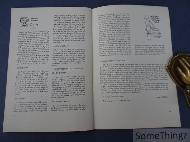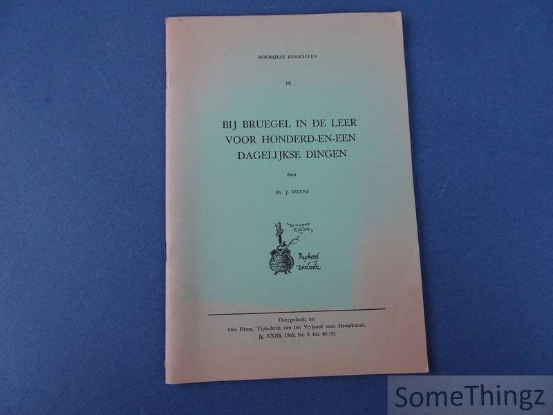 Overdruk uit: Ons Heem. - 23:3(1969). Het werk is een cultuurhistorische studie waarin beeldmateriaal uit de zestiende eeuw wordt geanalyseerd om aspecten van het dagelijkse leven in de historische Nederlanden te verklaren. De auteur bespreekt uiteenlopende elementen van het vroegmoderne bestaan, zoals huiselijke voorwerpen, ambachtelijke activiteiten, voeding, kleding en leefgewoonten, en legt uit hoe deze onderwerpen in historische schilderkunst worden weergegeven. Door de combinatie van kunsthistorische interpretatie en volkskundige benadering ontstaat een onderzoek dat laat zien hoe visuele bronnen kunnen dienen als documentatie van materiele cultuur. De publicatie vormt tevens een bijdrage aan het onderzoek en de educatieve werking van het openluchtmuseum in Bokrijk, waar vergelijkbare objecten en tradities worden bestudeerd en gepresenteerd binnen een bredere context van regionale geschiedenis. Jozef Weyns was een Belgische volkskundige en museumdirecteur die een belangrijke rol speelde bij de ontwikkeling van het openluchtmuseum in Bokrijk en bij het onderzoek naar traditionele leefcultuur in Vlaanderen. Hij publiceerde studies over landelijke architectuur, gebruiksvoorwerpen en historische leefgewoonten en combineerde volkskunde met museologische praktijk. Zijn werk droeg bij aan de documentatie en interpretatie van regionaal erfgoed en maakte historische cultuur zichtbaar voor een breed publiek.
