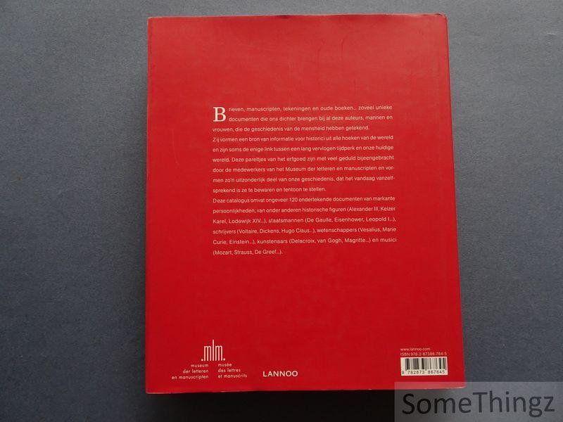 Brieven, manuscripten, tekeningen en oude boeken... zoveel unieke documenten die ons dichterbij al deze auteurs brengen, die de geschiedenis van de mensheid hebben gemaakt. Met veel geduld bijeengebracht en verzameld door de teams van Het Museum der letteren en manuscripten, vormen deze rijkdommen van het patrimonium zo'n uitzonderlijk deel van onze geschiedenis, dat het vandaag aanbevelenswaardig is ze te bewaren en tentoon te stellen. Dit werk verenigt ongeveer 120 documenten ondertekend door historische peronages (Alexander de IIIde, Karel de Vijfde, Lodewijk de XIVde), staatsmannen (De Gaulle, Eisenhower, Leopold I...), schrijvers (Voltaire, Dickens, Hugo Claus...), wetenschappers (Vesalius, Marie Curie, Einstein...), kunstenaars (Delacroix, Van Gogh, Magritte...) en musici (Mozart, Strauss, De Greef...) onder de meest beroemde persoonlijkheden.