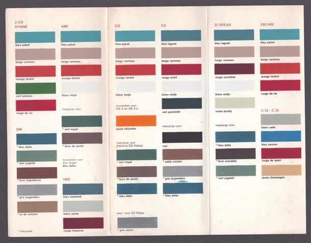 | Bijzonderheden: | 1975, Zeer goed, Openslaande kaart op dik papier met de kleuren die gebruikt werden voor: 2 CV Dyane., SM., Ami ., 1600 ., GS ., CX ., 23 Break ., 240 / 4000., C 32 - C 35. |