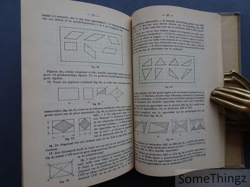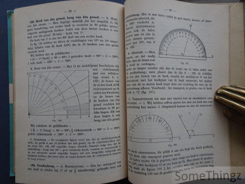 Rekenkunde en intuïtieve meetkunde is een schoolboek uit de jaren vijftig dat klassieke rekenkundige methoden en meetkundige inzichten op een intuïtieve en didactische wijze samenbrengt. Het werk was bestemd voor middelbare scholieren die een stevige basis in zowel getallenleer als elementaire geometrie moesten verwerven. Door duidelijk gestructureerde uitleg, voorbeelden en illustraties helpt het de leerling essentiële bewerkingen en ruimtelijke inzichten te ontwikkelen. De combinatie van rekenkundige vaardigheden met meetkundige intuïtie weerspiegelt het pedagogisch denken van midden twintigste eeuw, waarin inzicht en oefening hand in hand gingen. Het boek is systematisch opgebouwd rond twee hoofdonderdelen: rekenkunde en intuïtieve meetkunde. Het eerste deel behandelt grondslagen van rekenkundige bewerkingen, breuken, procenten, verhoudingen, algemeen getallenbegrip en praktische toepassingen. Het tweede deel richt zich op elementaire meetkunde: punten, lijnen, hoeken, vlakken, vlakke figuren en hun eigenschappen, en eenvoudige ruimtelijke figuren met visuele uitleg en voorbeelden. Door talrijke diagrammen, schema?s en oefenvragen maakt het de abstracte concepten toegankelijk voor leerlingen. Oefeningen zijn gekoppeld aan praktische contexten, wat de intuïtieve benadering van meetkunde benadrukt.
