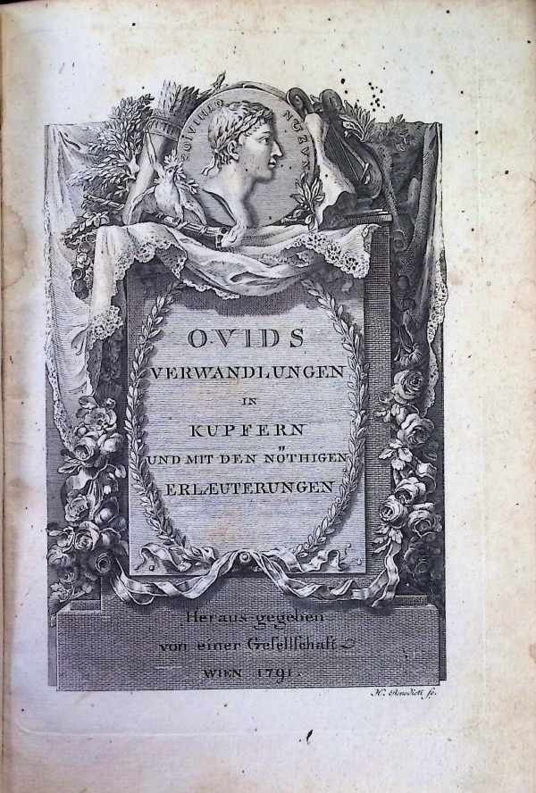 Half-leer (hardcover), 22 x 16 cm, VII + 137, 246, 163 + 139 pagina's brede etsen pp., Duits, 1e editie, illustraties, boekconditie: Zeer Goed. Een paar pagina's zijn licht bevlekt; sommige gravures hebben vlekken van morsen. De binding is nog steeds zeer stevig, hoewel de hoeken zijn beschadigd. 1. De Verhalen (De Metamorfosen) De kern bestaat uit meer dan 250 mythen, elk gecentreerd rond een transformatie (metamorfose). De chronologie loopt van de schepping van de wereld uit Chaos tot de deificatie van Julius Caesar: Deel 1: Behandelt de schepping, de Zondvloed (Deucalion en Pyrrha) en vroege verhalen van de goden, zoals Apollo en Daphne. Deel 2: Bevat dramatische verhalen zoals de val van Phaethon en de avonturen van Hercules. Deel 3: Richt zich op de Trojaanse Oorlog en de overgang naar de Romeinse geschiedenis. 2. De 'Nöthigen Erläuterungen' (Uitleg) Wat deze editie uniek maakt, is de uitgebreide commentaar van de "Gesellschaft" (de vereniging van redacteuren). Voor elk verhaal gaven ze: Historische interpretatie: Waar komen deze mythen vandaan? Wetenschappelijke uitleg: Soms probeerden ze een mythe uit te leggen als een symbool voor een natuurlijk fenomeen. Morele lessen: In de 18e eeuw (de Verlichting) werd het als belangrijk beschouwd dat lezers leerden van de fouten van de goden en helden. De tekst legt vaak uit welke deugd of ondeugd verborgen is binnen een verhaal. 3. Het Visuele Verhaal (De 'Kupfern') De 139 kopergravures zijn niet alleen decoratief; ze zijn bedoeld als een prentenboek. De gravures tonen vaak het exacte moment van de transformatie (bijvoorbeeld, vingers die in takken veranderen). Aangezien boeken in 1791 erg duur waren, dienden deze platen ook om de verhalen toegankelijk te maken voor een publiek dat de complexe Latijnse bronnen niet rechtstreeks kon lezen.