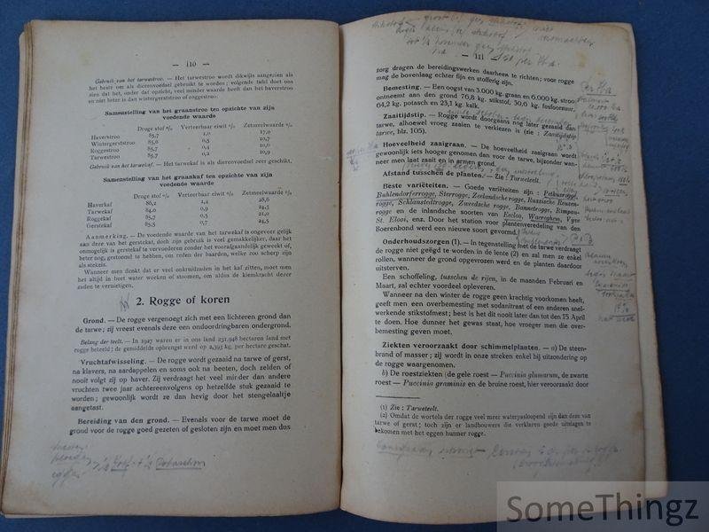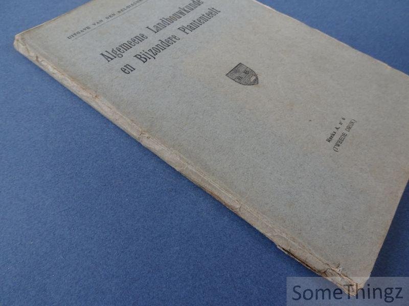 Inhoud: Deel 1. Algemeene landbouwkunde: A. Zaad en bezaaiingen, B. Bescherming en verpleging der gekweekte gewassen gedurende hun groei, C. Oogsten, verwerken en bewaren landbouwproducten; Deel 2. Bijzondere teelten: I. wortel- en knolgewassen, II. Graangewassen, III. Nijverheidsteelten, IV. Voedergewassen, V. Graslanden. "Algemeene landbouwkunde en bijzondere plantenteelt" is een landbouwkundig handboek uitgegeven door de Belgische Boerenbond met als doel landbouwers en studenten een systematisch overzicht te geven van de basisprincipes van de landbouw en de teelt van belangrijke landbouwgewassen. Het werk behandelt zowel de algemene theorie van de landbouwproductie als de praktische methoden voor het telen, verzorgen, oogsten en bewaren van gewassen. Door de combinatie van theoretische uitleg en praktische richtlijnen vormde het boek een nuttige leidraad voor landbouwonderwijs en voor de dagelijkse praktijk op het landbouwbedrijf. Het werk is opgebouwd uit twee grote delen die samen een overzicht bieden van de algemene landbouwkunde en de specifieke teelt van verschillende gewassen. In het eerste deel, "Algemeene landbouwkunde", worden de basisprincipes van de landbouw besproken. Daarbij komen onder meer het gebruik en de keuze van zaaizaad, de methoden van bezaaiing, de bescherming en verzorging van gewassen tijdens hun groei, en de technieken voor het oogsten, verwerken en bewaren van landbouwproducten aan bod. Het tweede deel, "Bijzondere teelten", behandelt de specifieke kenmerken van verschillende groepen landbouwgewassen. Achtereenvolgens worden wortel- en knolgewassen, graangewassen, nijverheidsteelten, voedergewassen en graslanden besproken. Voor elk van deze teelten beschrijft het boek de eigenschappen van de gewassen, de geschikte bodem- en klimaatomstandigheden, de teeltmethoden en de praktische verzorging tijdens de groei. Het werk vormt daardoor een overzichtelijk naslagwerk voor landbouwers en studenten die zich willen verdiepen in de traditionele landbouwpraktijk.