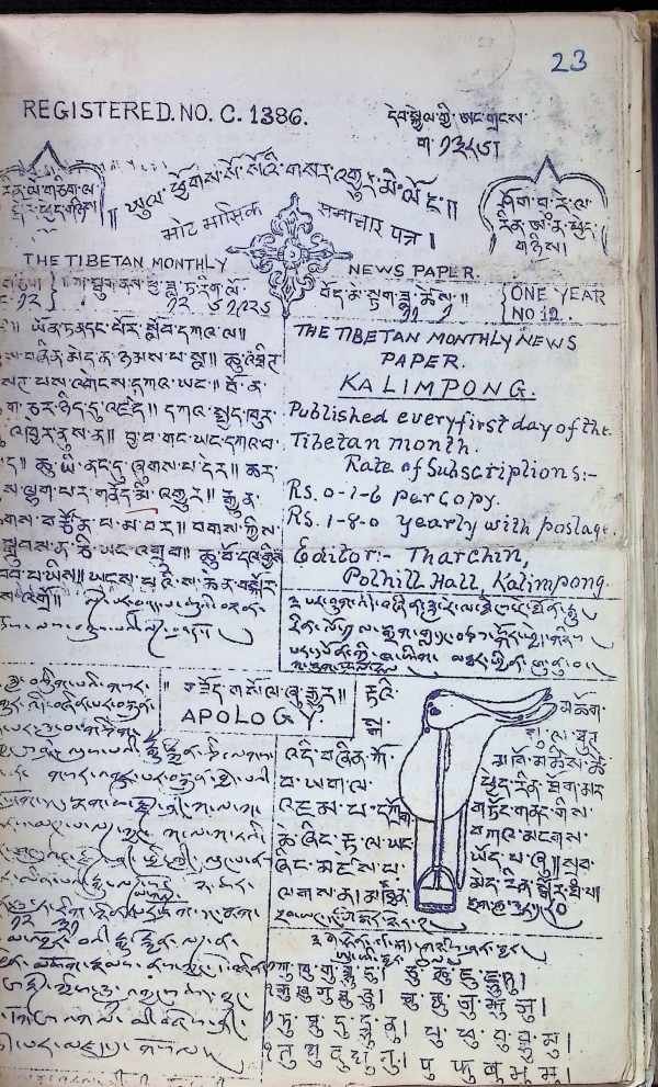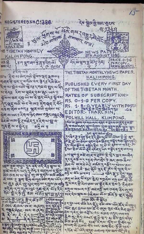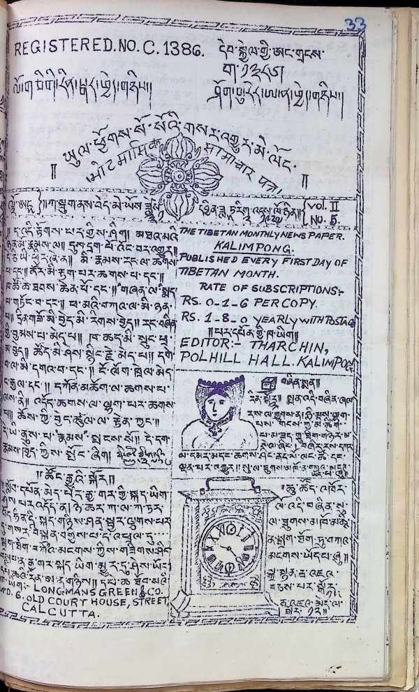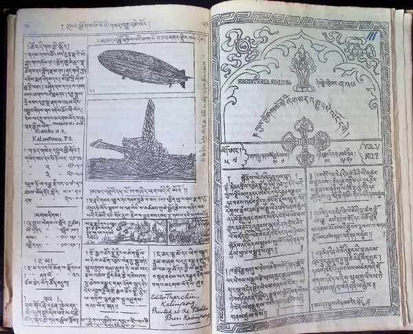 IFolio (34,4 x 19,5 cm): 60 afleveringen (4 dubbel) in blauwe en zwarte stencil (install. 11, vol. III gedrukt in goud) totaal 122 ff. handgenummerd in blauwe potlood, illustr. (2 tekstlvs op rood papier gebonden met; over het algemeen goede staat). Contemp. half zwart schapenleer, titel in goud op platte rug (naden gebroken, hoeken stomp). Enige bekende uitgave die compleet is van de eerste 5 jaar, ontbreekt in alle wereldwijd geregistreerde sets, inclusief 1925-1926, het allereerste volume. In 1925 werd "Yul phyogs so so?i gsar ?gyur me lon" (vaak afgekort als "me lon" en "melon") of de "Tibetaans Nieuwsblad", ook bekend als "De Spiegel van Nieuws" of "De Tibet Spiegel", opgericht in Kalimpong in West-Bengalen, India. Gepubliceerd na "The Ladakh Journal", is het de tweede Tibetaanse krant die is gestart, volgens beschikbare gegevens. De oprichter was een Gergan Dorje Tharchin, een Tibetaan van christelijke denominatie die op dat moment een pastor was in Kalimpong, een grensstad die fungeerde als centrum voor de wolhandel tussen Tibet en India. Hij werd geboren in 1890 in Himachal Pradesh en werd opgeleid door Moravische zendelingen, hoewel hij zijn krant niet gebruikte als platform om het christendom aan zijn lezers te verkondigen. Gepubliceerd op maandelijkse basis, werd het eerste record van het tijdschrift gegeven in oktober 1925 onder de titel "De Spiegel van Nieuws van Alle Zijden van de Wereld", gevolgd door een tweede in februari 1926. Er werden slechts 50 exemplaren gedrukt en allemaal naar Tharchin's vrienden in Lhasa gestuurd, inclusief één voor de 13e Dalai Lama die een brief stuurde waarin hij hem aanmoedigde door te gaan met de publicatie en een fervent lezer werd. De oprichter Tharchin was tegelijkertijd journalist, hoofdredacteur en uitgever. Hij selecteerde het nieuws uit kranten waarvan hij abonnee was, en vertaalde deze naar het Tibetaans. Hij had zichzelf de taak toegewezen om Tibet te openen voor de buitenwereld. Het tijdschrift rapporteerde over wat er in de wereld gebeurde tijdens de Chinese Revolutie, de Tweede Wereldoorlog, de Indiase onafhankelijkheidsbeweging en behandelde gebeurtenissen in Tibet, India en in Kalimpong zelf. Hoe meer het informeerde over de westerse materiële beschaving zoals grammofoon, fotocamera, klokken, zaklamp, paardenzadel, vulpen, drukpers, een auto, enz., allemaal geïllustreerd. Men vindt ook in de tekst de fotografische portretten van de 13e en de 14e Dalai Lama, een klein uitzicht op het Potala-paleis in Lhasa, de crash van een zeppelin, enz. Begonnen als een Tibetaans talig chroniek van wereldgebeurtenissen, werd het in de jaren vijftig een voertuig voor de strijd voor Tibetaanse vrijheid van de Chinese invasie en bezetting. Begin jaren zestig, met financiële problemen die maar niet leken te eindigen, stopte Tharchin de publicatie in 1963 en stierf in 1976. Blijkbaar is onze set de enige die bekend is en de complete eerste 5 volumes (1925/1926-1930) bevat, aangezien noch de "Beinecke Rare Book and Manuscript Library" aan de Yale Universiteit, noch "The Tharchin Collection" aan de Columbia Universiteit, zijnde Tharchin's persoonlijke archieven, complete reeksen hebben, beide beginnend met het jaar 1930 (behalve één record - vol. 2, n. 5 - aan Columbia). Ref. Paul G. Hackett, Barbarian Lands: Theos Bernard, Tibet, and the American Religious Life. Ph.D. dissertation, Columbia University, 2008. Volume 1 : 1925/1926 : 1 – 12 compleet volume 2 : 1927 : 1 – 12 compleet Volume 3 : 1928 : 1 – 12 compleet Volume 4 : 1929 : 1 – 12 compleet Volume 5 : 1930 : 1 – 12 compleet [Deze omschrijving kan vertaald zijn met AI.] Gegen (Gergan) Dorje Tharchin, 1925, Kalinpong |