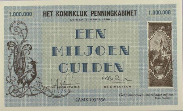 | Meer info: | Bankbiljet van een miljoen gulden. Leiden, De Ammoniet. 1996. Blad, 12 x 19,5 cm. ca. 350 exx. l Post van der Molen / Rijkse 3.30. Met een citaat van Remco Campert: Geld moet rollen, vooral naar mij toe. |
