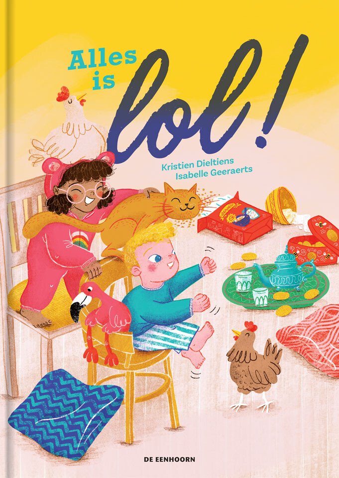 » Op de rechterpagina wordt de stapel rommel steeds groter en groter … » Met veel details en kleur brengt Isabelle Geeraerts dit guitige verhaal van Kristien Dieltiens tot leven Twee spelende kinderen hebben plezier, en laten een steeds grotere stapel rommel achter. Felix mag een nachtje bij buurmeisje Fidda slapen. ‘Morgen gaan we lol maken,’ fluistert Fidda. ‘Wat is lol?’ vraagt Felix. Dat laat Fidda hem maar al te graag zien! Ze spelen vliegtuigje, maken een poezenbrokkentrein en toveren de keuken om tot een dierentuin. Het huis wordt steeds vuiler en rommeliger. Tot de ouders van Fidda binnenkomen … |