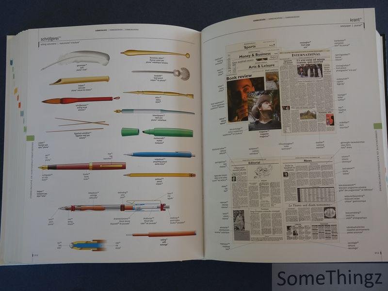 Dit beeldwoordenboek is thematisch opgebouwd en presenteert de woordenschat via visuele representaties in plaats van traditionele alfabetische ordening. De inhoud is verdeeld over zeventien thematische domeinen die het dagelijkse leven en de materiele wereld bestrijken, zoals het menselijk lichaam, kleding, huis en interieur, transport, technologie en natuur. Elk onderwerp wordt geïllustreerd met gedetailleerde afbeeldingen waarin objecten en onderdelen systematisch worden benoemd in drie talen: Nederlands, Engels en Frans. Door deze visuele aanpak fungeert het boek zowel als taalverwervingsinstrument als referentiewerk voor terminologische precisie. De combinatie van beeld en woord maakt het bijzonder geschikt voor taalonderwijs, zelfstudie en professionele contexten waarin snelle identificatie van termen noodzakelijk is. Registers in de drie talen ondersteunen de toegankelijkheid en maken gerichte opzoeking mogelijk, terwijl de thematische structuur een semantisch netwerk van begrippen blootlegt dat verder gaat dan louter vertaling en inzicht biedt in conceptuele verbanden tussen objecten en functies.