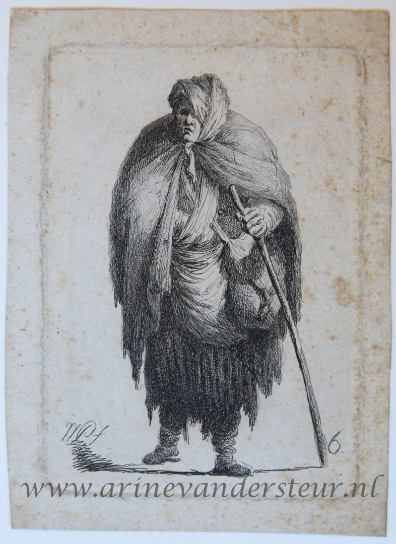| Bijzonderheden: | A beggar woman with a walking stick, plate 6 in a series. Signed: ‘MPf’Numbered as "6" on bottom right. From the set "Recueil de dix neuf Etudes Gravées à l'eau forte par Mr Plonski", 1802. |