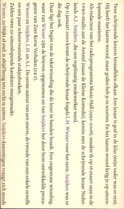 [Utrecht], Stichting De Roos, 2007. Twee delen in foedraal (waarop de inleiding door Wim Noordhoek is gedrukt). 120; 48 p. Typografie Piet Gerards Ontwerpers. Gedrukt in een oplage van 175 genummerde exemplaren. 1e druk. Mooi! Selectie van 31 Zeer Korte Verhalen (ZKV) van A.L. Snijders en brieven van L.H. Wiener aan Snijders (2000-2006). Inventieve vormgeving van Piet Gerards (let op de subtiele kleurverschillen!). De Roos 167.
