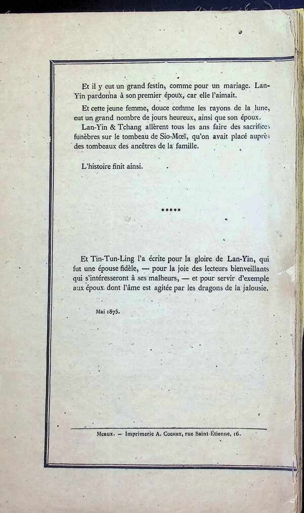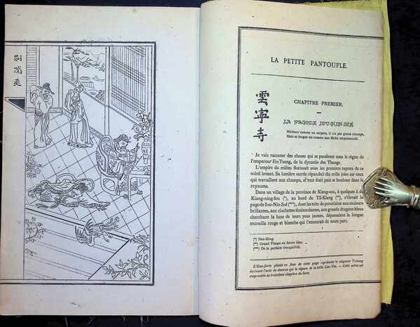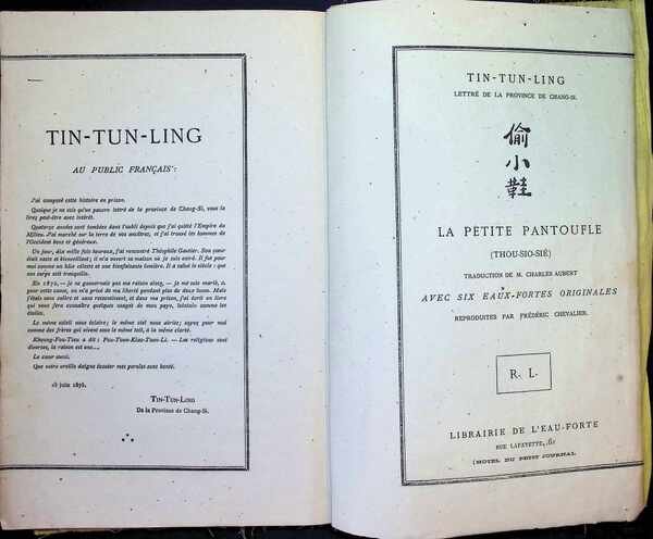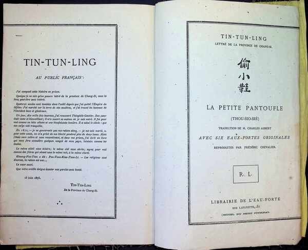 Dit is een Chinese roman die in 1875 in Parijs werd gepubliceerd door Tin-Tun-Ling (Ding Dunling), een Chinese geleerde uit de provincie Shanxi. Tin-Tun-Ling was een politiek vluchteling in Frankrijk en een goede vriend van de bekende schrijver Théophile Gautier. Hij verbleef een tijd in het huis van de familie Gautier en gaf zelfs Chinese les aan de dochters van de schrijver. Het werk werd uitgegeven in een bijzondere Frans-Chinese editie op bamboepapier. Het bevat een voorwoord in de vorm van een brief waarin de auteur zijn dankbaarheid uitspreekt aan Gautier. De tekst werd vertaald door Charles Aubert. De originele editie bevat zes etsen die gereproduceerd zijn door Frédéric Chevalier. Het werd gepubliceerd door de Librairie de l'Eau-forte, beheerd door Richard Lesclide (de secretaris van Victor Hugo). [Deze omschrijving kan vertaald zijn met AI.] Librairie de l'Eau-Forte, 1975, Paris |