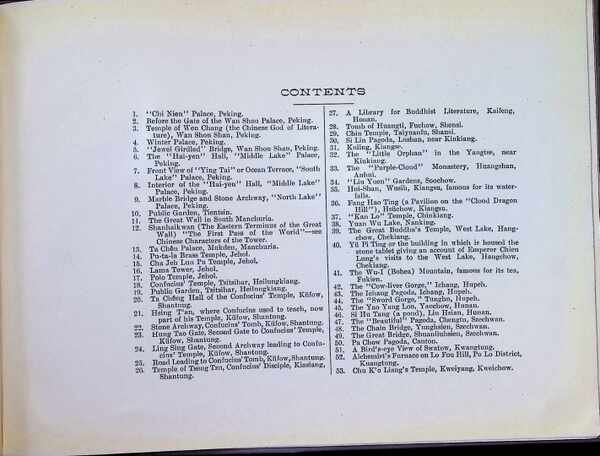 Hoeken van de kaft vertonen kleine onvolkomenheden, de kaften zijn licht vervuild, de binding is nog zeer stevig, 5 pagina's hebben een scheurtje van 1,5 cm. 55 ongenummerde bladen zijn enkelzijdig bedrukt: de foto's zijn op de rechterpagina (recto) gedrukt, terwijl de linkerpagina (verso) blanco is, tweetalige teksten Engels/Chinees. Dit boek, getiteld “Views of China P.P.I.E 1915”, is een zeldzaam fotoboek dat in 1915 in Peking werd uitgegeven ter gelegenheid van de Panama-Pacific International Exposition (P.P.I.E.) in San Francisco, specifiek de Chinese nationale commissie in Peking. Het diende als een officieel aandenken en was bedoeld om de "nieuwe" Republiek China aan de wereld te presenteren. • Inhoud: Het bevat 53 zwart-wit fotoplaten met afbeeldingen van beroemde Chinese tempels, tuinen, landschappen en zowel publieke als private gebouwen. • Ontwerp: De omslag is van blauwe stof met goudopdruk in het Engels en Chinees, versierd met een uitgebreid wit bloemmotief (blauweregen en pioenen, zoals te zien op de afbeelding). • Taal: De lijst met afbeeldingen en de teksten zijn tweetalig, in zowel het Engels als het Chinees. Het boek is compleet en ondanks de kleine mankementen in zeer goede staat en zeer zeldzaam. [Deze omschrijving kan vertaald zijn met AI.] Panama-Pacific International Exposition (P.P.I.E.), 1915, Peking (Beijing) |