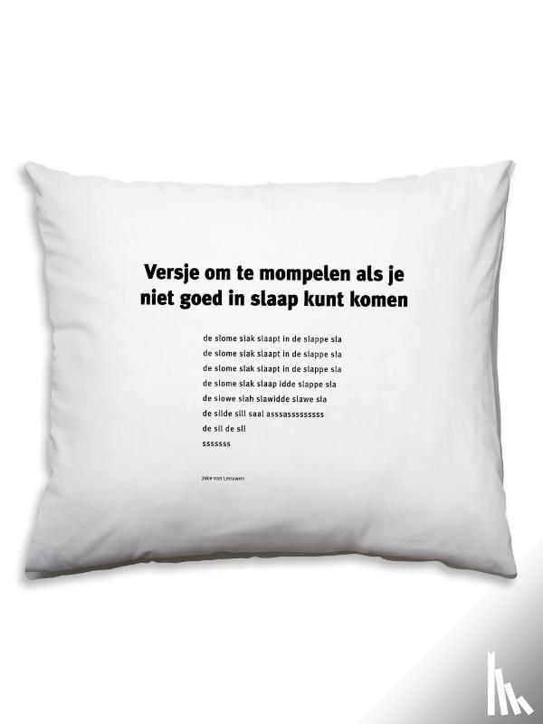 | Meer info | Flaptekst Kussensloop 2-zijdig bedrukt. Op de voorkant staat het gedicht 'Versje om te mompelen als je niet goed in slaap kunt komen' (zwarte letters). Op de achterkant staat het gedicht 'Versje om te mompelen als je niet wakker kun worden'(oplichtende inkt - alleen zichtbaar in het donker (wel eerst even 'opladen' onder een lamp. |