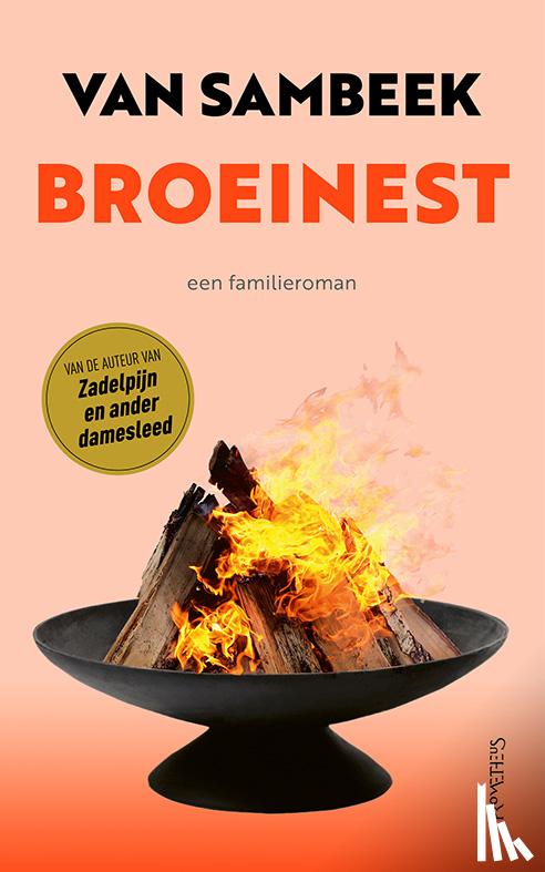 | Meer info | Flaptekst ‘De beerput is weer open.’Ruim een jaar na het overlijden van haar hoogbejaarde moeder krijgt Renate plotseling een mail van haar oudste broer Rinus, die vraagt of de uitkering van de erfenis kan worden herzien. Renate weigert.Dit bericht zet meteen de toon voor de aanstaande familiereünie, waarin Renate, Rinus, hun zus Roos en hun broer Ruud, allen de 65 gepasseerd, een beerput aan oude familieruzies, nare herinneringen en wederzijdse verwijten opentrekken.Voor Renate komen de naweeën van haar jeugd in alle hevigheid terug. Ze komt alleen te staan. Het leven in dit beklemmende naoorlogse gezin heeft ook bij haar broers en zus de nodige sporen nagelaten. Waarom lukt het de een wel om het tij te keren, terwijl de ander verstrikt blijft in hulpeloos zelfbeklag?Bijna twintig jaar na het enorme succes van Zadelpijn en ander damesleed en negen jaar na haar laatste bestseller Pensionado’s heeft Van Sambeek opnieuw een verrassende roman met een lach en een traan geschreven. Als geen ander weet ze de o zo herkenbare levens van haar generatie te vangen in haar even ontroerende als geestige boeken. Broeinest is een nieuw bewijs van Van Sambeeks treffende observatievermogen. Het perfecte boek voor iedereen die dubbele gevoelens heeft over de eigen familie.Van Sambeek (1949) schreef onder meer de enorme bestsellers Zadelpijn (250.000 exemplaren verkocht) en Het verwende nest (150.000 exemplaren verkocht), die werden verfilmd en ook als musical veel succes hadden. Haar laatste boek, Pensionado’s, stond wederom in de bestsellerlijsten.Over Zadelpijn:‘Het boek is heftig, hilarisch en ontroerend, en niet altijd vrouwvriendelijk. Dat maakt het confronterend voor een hele generatie.’de volkskrantOver Pensionado’s:‘Van Sambeek beschrijft met het nodige venijn hilarische confrontaties en verrassende inzichten.’margriet |