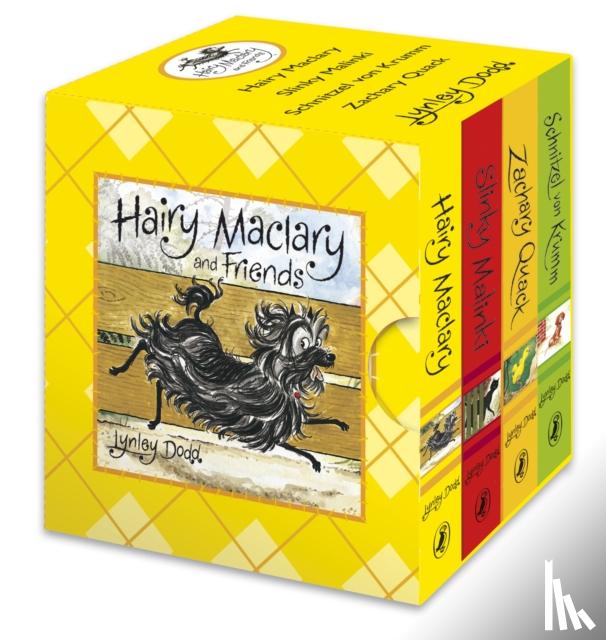 | Meer info | Annotatie Four little Hairy Maclary board books in a slipcase, perfect for little fingers and hands. The books introduce Hairy Maclary, and some of his friends: Slinky Malinki, Zachary Quack and Schnitzel Von Krumm. Sales of Lynley Dodd's Puffin titles now exceed 6 million copies Flaptekst An introduction to the many adventures of Hairy Maclary and friends. It is suitable for tiny fingers and little hands. |