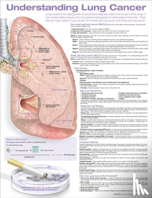 | Meer info | Flaptekst The chart also describes how lung cancer can be prevented, includes a graphic showing how to calculate number of pack years along with an image of a cigarette in ashtray and the statistic that approximately 90 percent of lung cancer deaths are related to smoking. |