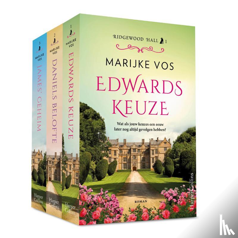| Meer info | Flaptekst Ontdek het geheim van Ridgewood Hall in alle drie de delen van deze meeslepende serie.(1)Ridgewood Hall, 1904. Edward Bellamy, de oudste zoon en erfgenaam van de graaf van Ridgewood, staat voor een onmogelijke keuze. Zijn hele leven is voor hem uitgestippeld en dus ook het huwelijk met de mooie Guinevere Parker, de dochter van een succesvolle zakenman. De komst van het Schotse dienstmeisje Gillian zet echter alles op zijn kop. Kiest Edward voor de plicht of volgt hij zijn hart? Ruim 100 jaar later. Na het overlijden van haar moeder erft Flora tot haar verbazing een roman, met daarin een oude brief die wijst op een bijzondere familiegeschiedenis. Op de vlucht voor haar verlies en de eenzaamheid vertrekt ze naar Edinburgh. Daar hoopt ze antwoorden te vinden op vragen over haar familie en zichzelf. Ze blijkt er echter ook het laatste te vinden wat ze had verwacht: een nieuwe kans in de liefde. Maar durft ze zich daarvoor open te stellen?(2)Ridgewood Hall, 1905. Daniel Bellamy, de jongste zoon van de graaf van Ridgewood, is net begonnen aan zijn veelbelovende carrière als professor op Cambridge. Wanneer hij de mooie Elizabeth ontmoet, weet hij niet wat hij moet denken van zo’n vrijgesproken vrouw die vecht voor haar ambities en gelijke rechten. Maar wat is belangrijker: zijn carrière of de liefde?Ruim 100 jaar later. Alsof de Londense Rose nog niet genoeg worstelt als alleenstaande moeder met twee jonge kinderen, raakt ze ook haar baan kwijt én zet ze zichzelf voor schut tijdens een lezing van haar favoriete auteur. De schaamte lijkt compleet als ze hem een week later letterlijk tegen het lijf loopt en hij haar herkent. Maar dan krijgt ze onverwacht bezoek van een achternicht met een wel heel bijzonder verhaal over hun familiegeschiedenis… (3) Ridgewood Hall, 1905. James kan de wending die zijn leven heeft genomen amper geloven. Hij vlucht het Londense nachtleven in en onttrekt zich aan zijn nieuwe verantwoordelijkheden. Dan maakt hij een desastreuze fout. Wanneer hij uit onverwachte hoek een aanbod krijgt dat zijn problemen kan oplossen, heeft hij geen andere keuze dan het te accepteren. Ook al betekent dat het opgeven van zijn vrijheid én… een kans op ware liefde.Ruim 100 jaar later. Iris leeft het snelle leven. Ze heeft een goede baan, veel vrienden en aan mannelijke aandacht geen gebrek. Wanneer er twee achternichten opduiken met een mysterieus verhaal over haar familiegeschiedenis, heeft ze daar dan ook weinig zin in. Als Iris noodgedwongen pas op de plaats moet maken, leert ze dat je soms mag leunen op anderen en dat liefde je simpelweg overkomt, juist als je het niet verwacht.‘Deze serie van Marijke Vos leest werkelijk als een tierelier. Ruim duizend bladzijden genieten à la Lucinda Riley.’ Nederlands Dagblad |