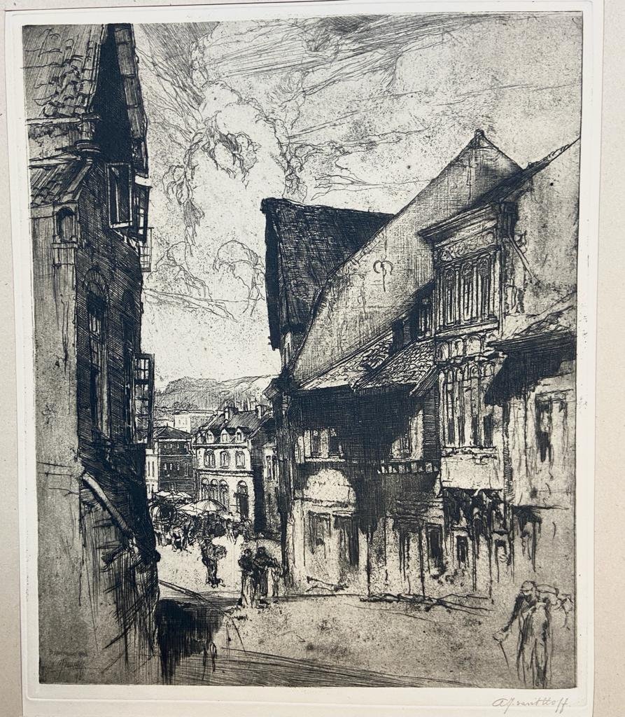 | Bijzonderheid: | A streetview of a city. The artist signed with his name below the print on the right side. |