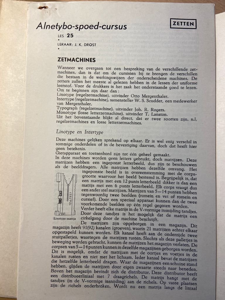 | Titel: | [Printing self-course, education, ca 1941] Alnetybo-spoed-cursussen: Zetten (Examenles), Kleurenleer, Nederlandse taal, Papierkennis, Zetmachines, Machinekennis, Reproductietechnieken, Schetsen, Vakgeschiedenis, Insluiten van vormen, Vlak- en ... |