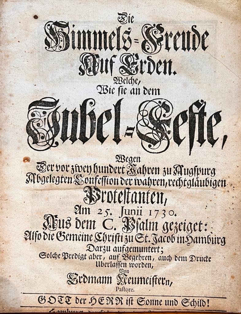 Erdmann Neumeister, Rudolph Beneke. - [Pamphlet, Germany, Sermon, 1730, Rare] Die Himmels-Freude auf Erden. Welche, wie sie an dem Jubel-Feste wegen der vor zwey hundert Jahren zu Augsburg abgelegten Confession der wahren, recht gläubigen Protestanten, ...