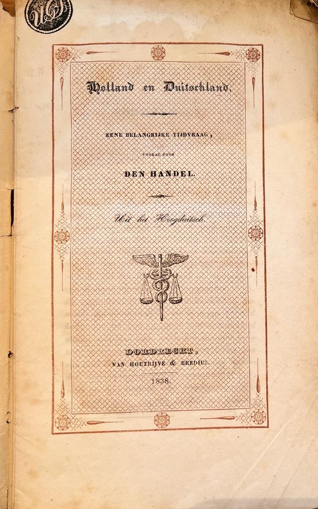 - [Germany, 1838] Holland en Duitschland, eene belangrijke tijdvraag, vooral voor den handel, uit het Hoogduitsch, Van Houtrijve & Bredius, Dordrecht, 1838, 77 pp.